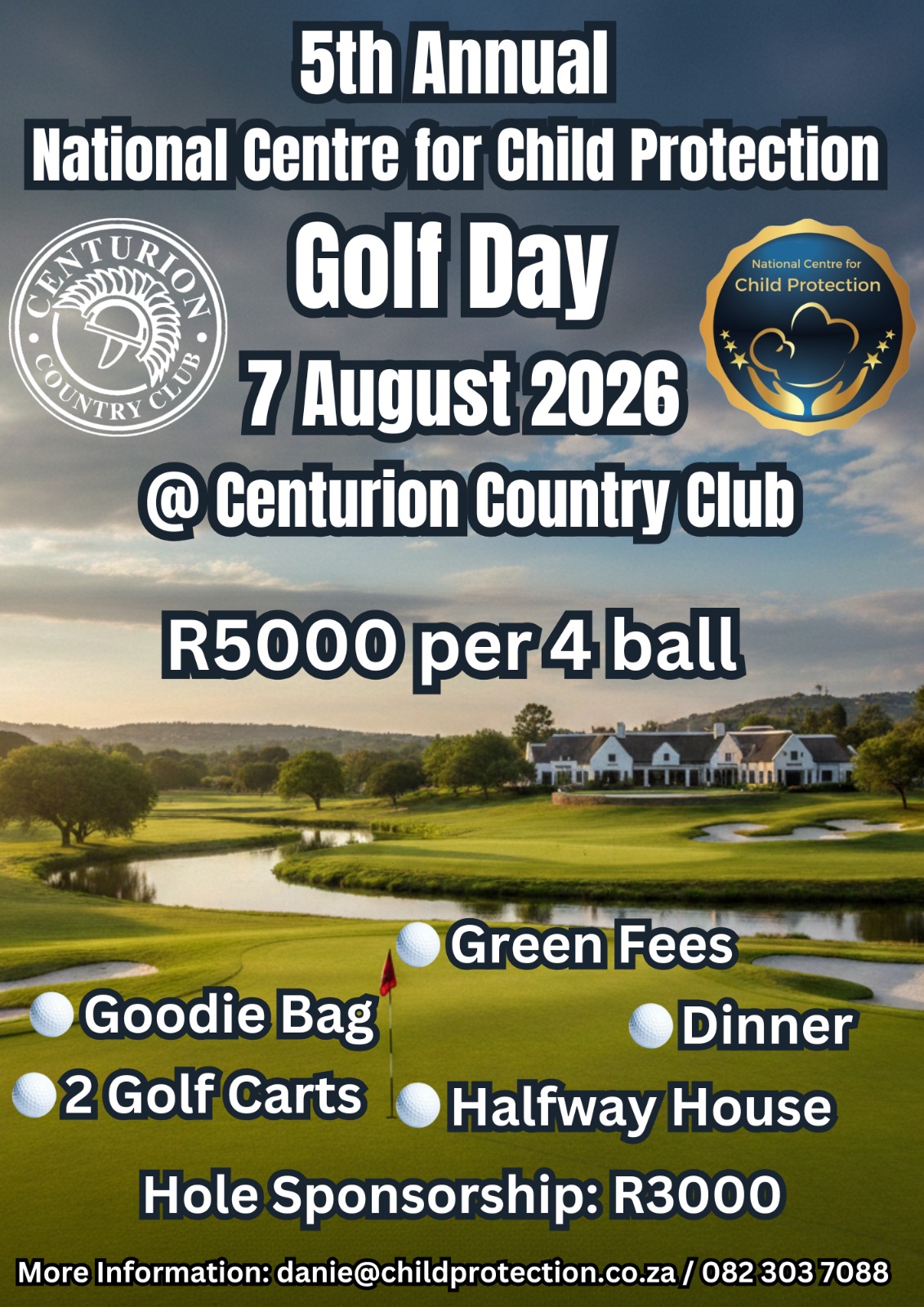 R5000 per 4-ball Includes: Green Fees, Goodie Bag, 2 x Golf Carts, Halfway House, Dinner. Hole sponsorship R3000